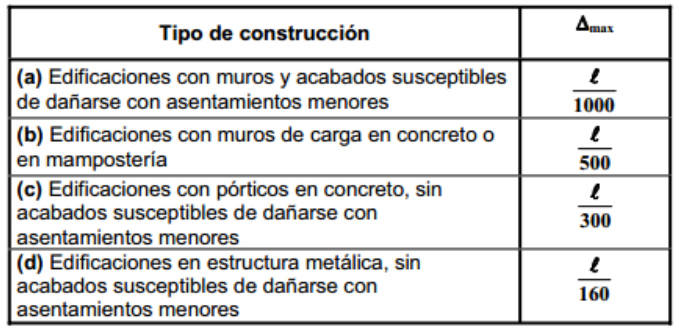 Notas Diseño De Estructuras De Cimentación Nsr10 Sin Ejemplos ID5cad16c4 Aquí la rigidez de la viga no estaría controlando el asentamiento diferencial (que para el caso, es un dato y no una variable) sino el valor del momento, generando un diseño dicotómico, es decir que a mayor rigidez, se requiere más acero, lo. Notas Diseño De Estructuras De Cimentación Nsr10 Sin Ejemplos ID5cad16c4 Aquí la rigidez de la viga no estaría controlando el asentamiento diferencial (que para el caso, es un dato y no una variable) sino el valor del momento, generando un diseño dicotómico, es decir que a mayor rigidez, se requiere más acero, lo. Asentamiento diferencial y distorsión angular en cimentaciones Criterios Asentamientos diferenciales y distorsión angular en suelos Uno de los aspectos más importantes a la hora de calcular los parámetros geotécnicos para el diseño de una cimentación es definir los criterios de asentamientos admisibles en suelos.