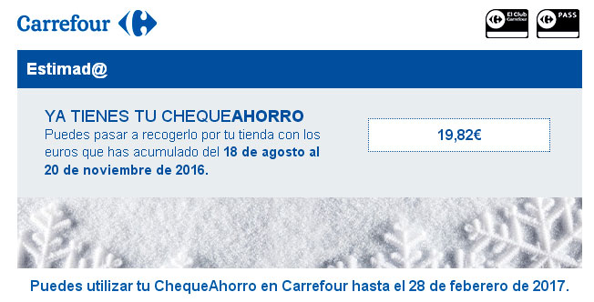 El Cheque ahorro Carrefour te devuelve dinero por cada compra con tu Tarjeta PASS para que ahorres cada día sin darte cuenta. El cheque ahorro es una especie de monedero electrónico para los que tengan una tarjeta Club Carrefour o Tarjeta Pass, de Carrefour también En ella te devuelven un porcentaje de tu compra en forma de saldo en éste cheque ahorro , y depende el tipo de producto que adquieras, recibirás un porcentaje, y entre los productos que forman parte, están los seguros de Seguros Carrefour y Carrefour Viajes. Para acceder a tu ChequeAhorro introduce el número de tu tarjeta de El Club Carrefour o código de 13 dígitos de PASS y pulsa en Validar Cuando pulses Validar, no te olvides de imprimir tu Cheque para canjear en tu próxima compra en Hipermercados Carrefour y Carrefour Market o toma nota de los 13 dígitos para su utilización en nuestra.