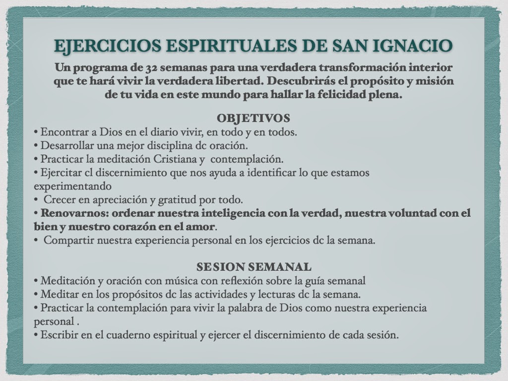 Introducción Los ejercicios de San Ignacio de Loyola, son la base de la espiritualidad jesuita, una vez preguntaron por que hay tantos jesuitas mártires y santos y la respuesta es sencilla, como no ser santos, si nuestro líder y maestro, nos dejo los ejercicios y las constituciones, un poco cursi, pero son nuestras El que escribe hizo los ejercicios en 40 días a los 26 años y luego. Un día como hoy hace 396 años, el Papa Gregorio XV canonizó a San Ignacio de Loyola, fundador de la Compañía de Jesús y creador de los ejercicios espirituales. Bajo este formato, la docena de participantes se comprometía a pasar media hora al día inmersa en los Ejercicios Espirituales de San Ignacio, usando como guía el libro del P Kevin O’Brien, SJ, titulado La aventura ignaciana (en inglés) Cada semana, entre septiembre y mayo, el grupo se reunía para compartir sus experiencias y reflexiones.