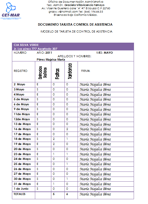 Grace Admon 2do Tarjeta Control De Asistencia