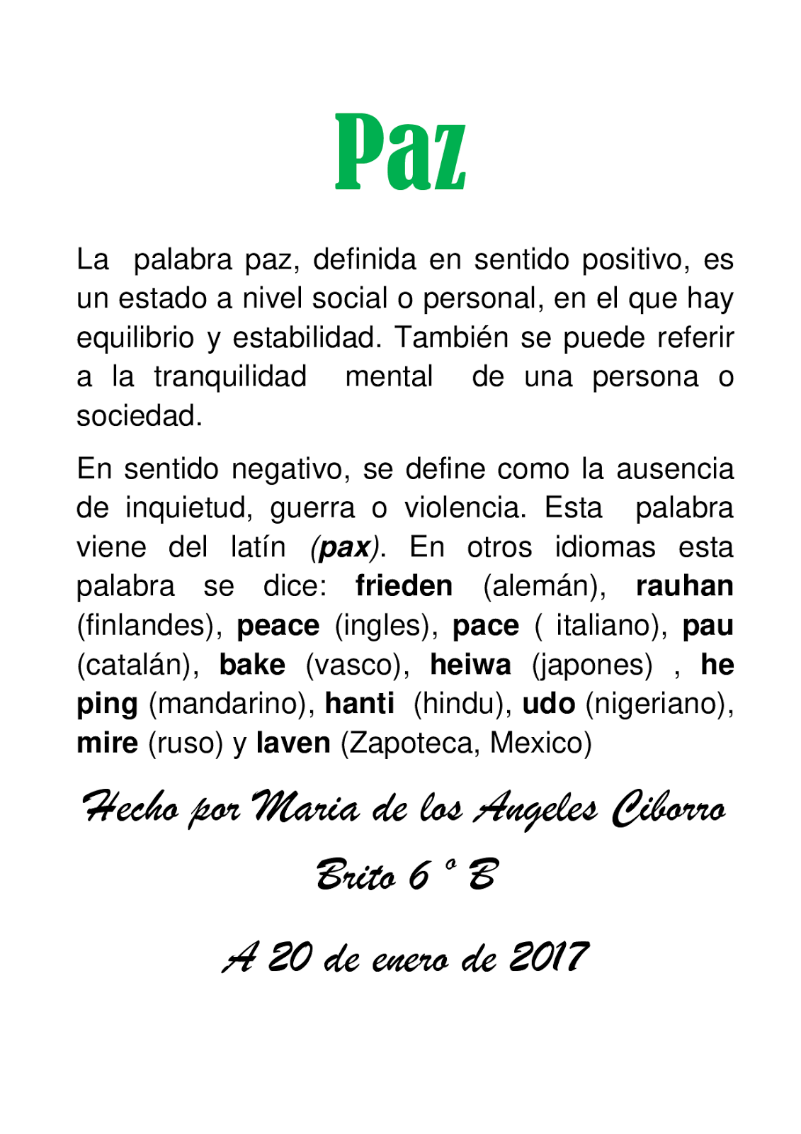 Paz en distintos idiomas Publicado por Teresita en sábado, julio 31, 10 No hay comentarios Publicar un comentario Entrada más reciente Entrada antigua Página principal. Ve el perfil de Paz Magdalena Maffioletti Celedon en LinkedIn, la mayor red profesional del mundo Paz Magdalena tiene 9 empleos en su perfil Ve el perfil completo en LinkedIn y descubre los contactos y empleos de Paz Magdalena en empresas similares. En cada eje se agrupan los programas, subprogramas y proyectos correspondientes CULTURA DE PAZ Es un modo de vida en el que las personas aplican métodos pacíficos, como el diálogo, la tolerancia y la cooperación en lugar de métodos violentos como las peleas, las amenazas, los gritos, el uso de armas o la fuerza.